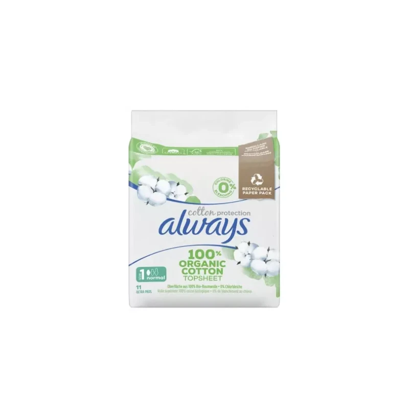 Always Cotton Protection 11 Serviettes Hygiéniques Taille 1 sont des serviettes dotées d’un voile supérieur 100% coton Biologique. Leur cœur est composé de cellulose et de gel absorbant qui transforme le liquide en gel pour empêcher les fuites. Les ailettes permettent à la serviette de rester en place. Leur finesse offre un confort optimal.