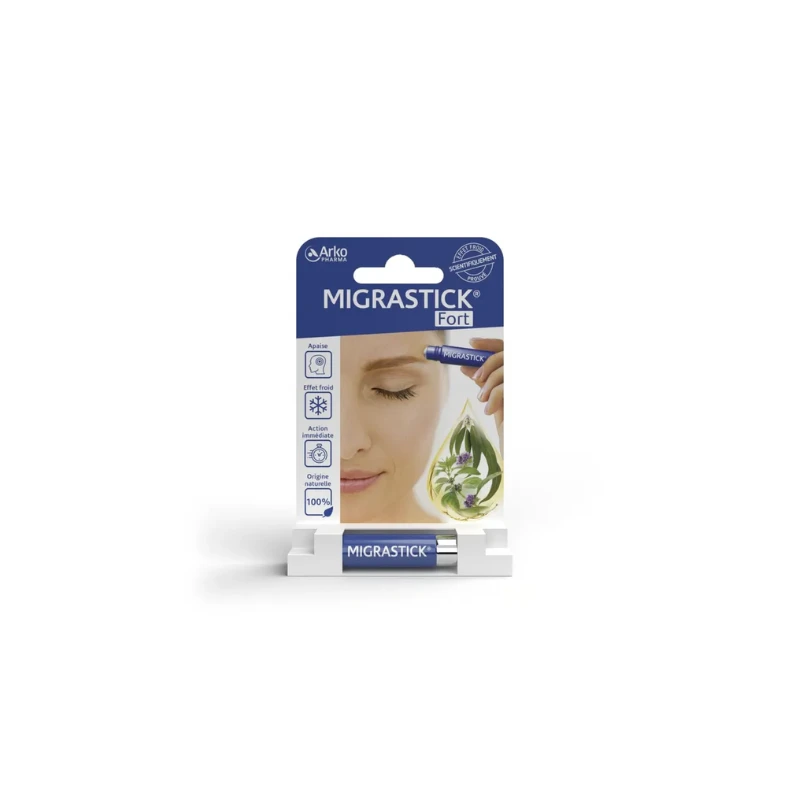 Le Migrastick® Fort de Arkopharma est formulé pour contribuer au bien-être général. Sa formule associe des ingrédients 100% d’origine naturelle dont l’Eucalyptol (issu de l’Eucalyptus Globulus) et le Menthol (issu de la Menthe des champs). Avec un roll-on intégré, il s’applique en massage et permet d’apaiser instantanément les tensions au niveau des tempes, du front et de la nuque.