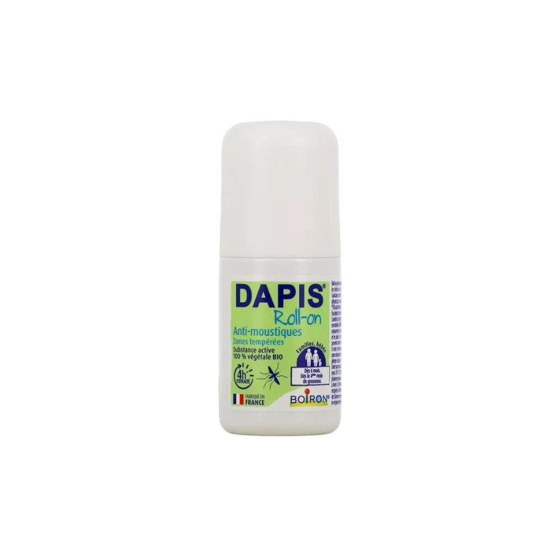 Roll-on anti-moustiques Dapis de Boiron, à l’huile d’amande douce pour toute la famille, y compris les bébés dès 6 mois et les femmes enceintes dès le 4ème mois de grossesse.