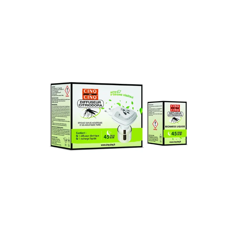 CINQ SUR CINQ Diffuseur Citriodora est un répulsif à base d’huile d’eucalyptus d’origine naturelle, qui vous protège des piqûres des moustiques communs (Culex quinquefasciatus) et des moustiques tigres (Aedes albopictus). La recharge liquide utilisée avec son appareil électrique vous protégera pendant 8 heures par nuit dans une pièce de 30 mètres cubes.