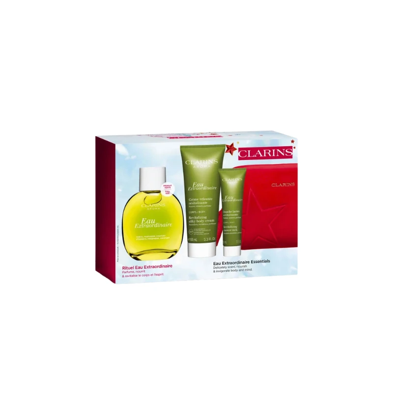 Ce coffret réunit l’Eau Extraordinaire, la toute dernière Eau de Soins Clarins, et deux soins corps au parfum revitalisant : une crème hydratante corps au beurre de karité bio et une crème douche enrichie en huile d’amande douce bio. Ce Rituel Force intérieure parfume, ravive la force intérieure et éveille les sens.