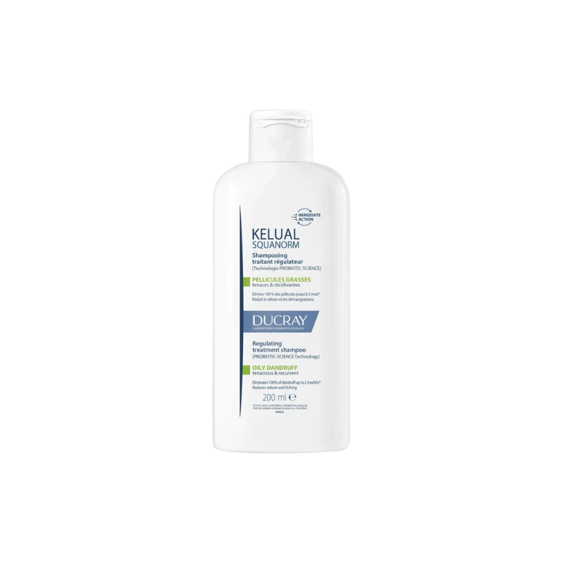 Le Shampooing Traitant Régulateur Kelual Squanorm de Ducray est spécialement conçu pour les pellicules grasses.