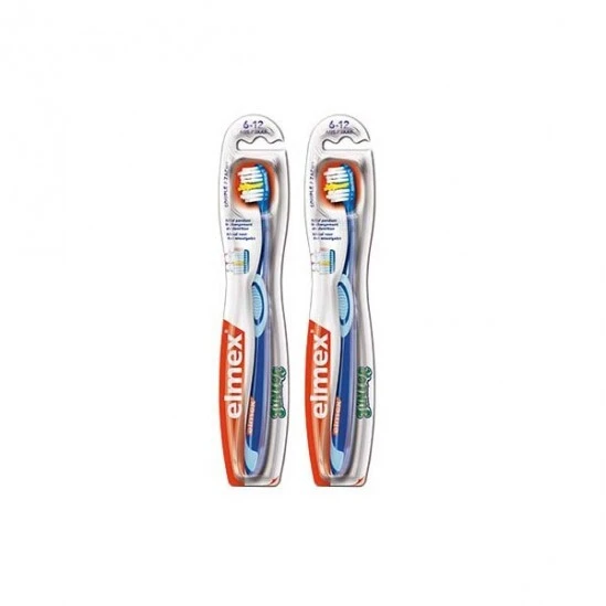 Junior 6-12 ans brosse à dents avec petite tête de brosse et brins en x pour faciliter le nettoyage minutieux des dentures mixtes.