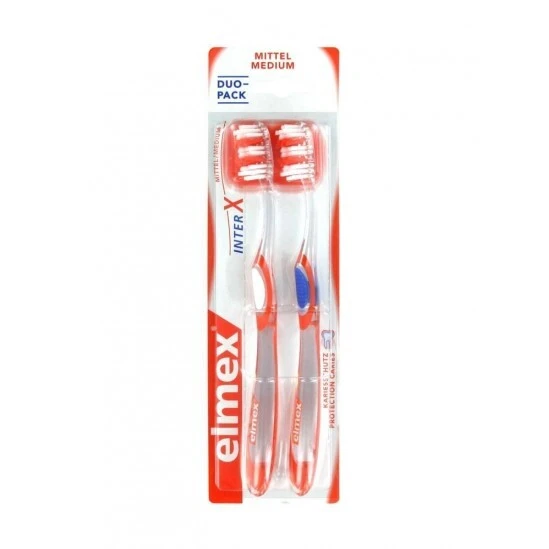 Elmex Duo Pack Inter X Médium 2 Brosse à Dents possède des brins en X, plus longs pour un nettoyage en profondeur jusque dans les espaces interdentaires. Elle nettoie