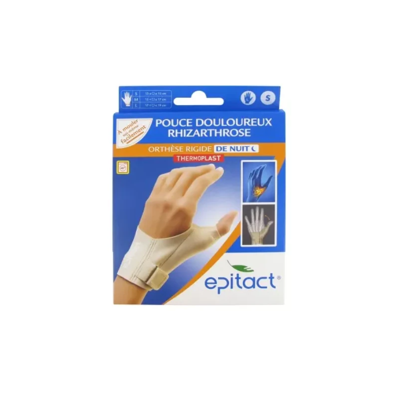 Epitact Orthèse Rigide de Nuit Pouce Douloureux Main Gauche est une orthèse thermoformable plusieurs fois, qui maintient le pouce en position de repos tout en se faisant oublier pendant le sommeil.