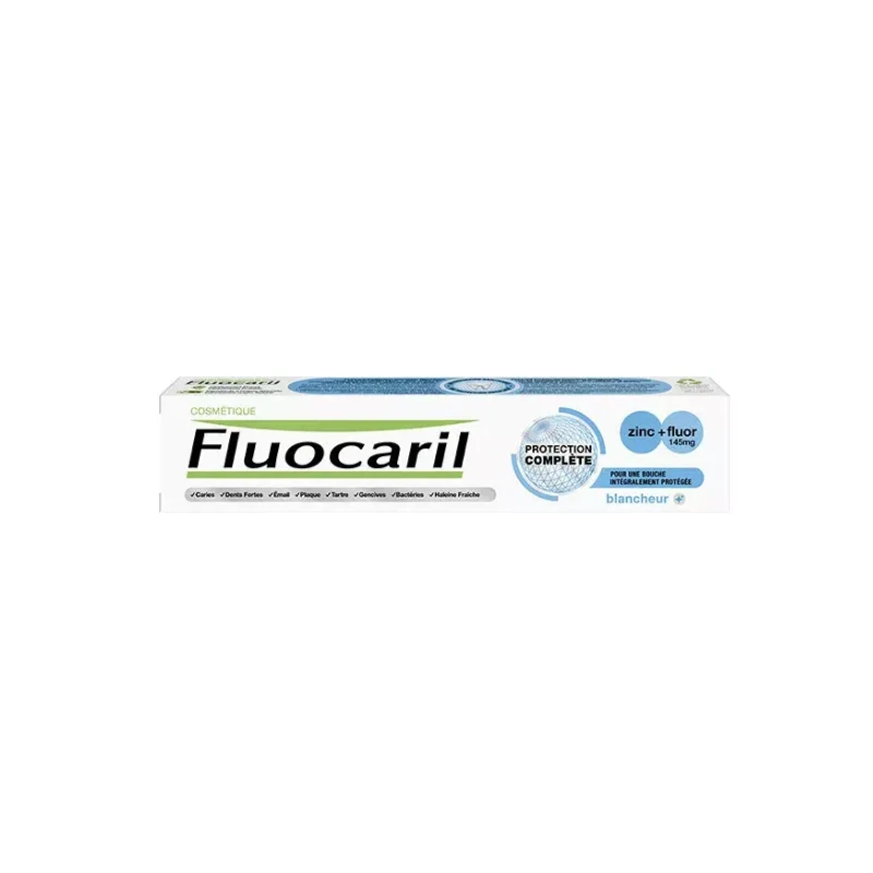 Le Dentifrice Blancheur Protection Complète de Fluocaril offre une protection complète de la bouche et une hygiène optimale grâce à sa formule enrichie en Zinc et en Fluor.