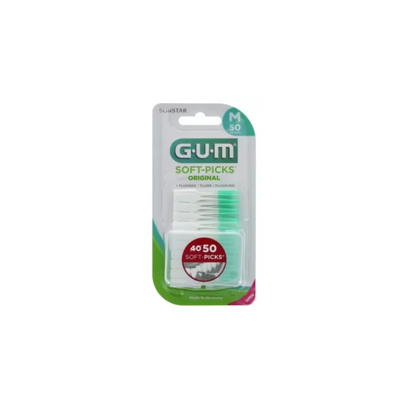 GUM Soft-Picks Original 50 Unités – Taille : Medium sont des bâtonnets interdentaires en caoutchouc et au fluor qui éliminent facilement et efficacement la plaque et les résidus alimentaires.