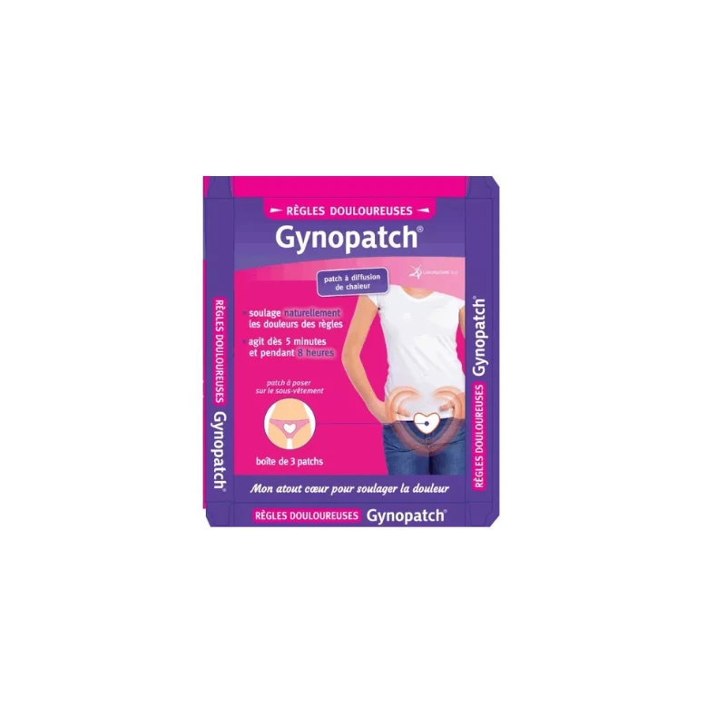 Gynopatch Règles douloureuses en patchs chauffants, qui a pour but de soulager naturellement les règles douloureuses grâce à la diffusion de chaleur.