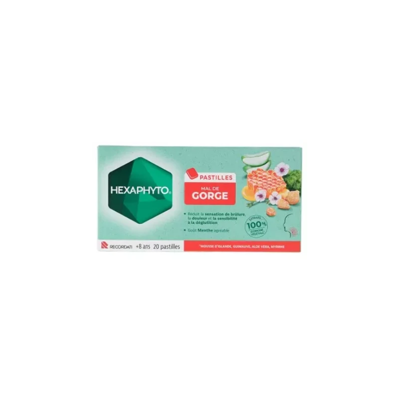 Hexaphyto Pastilles Mal de Gorge Goût Menthe 20 Pastilles est un dispositif médical spécialement conçu pour traiter les irritations de la gorge, telles que la pharyngite ou l’amygdalite.