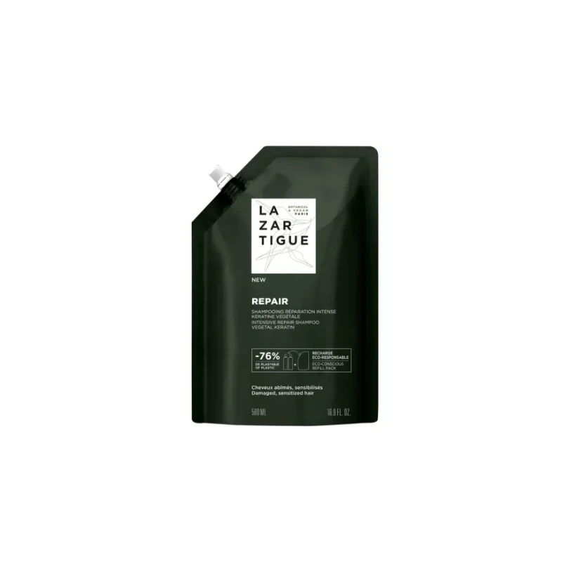 Shampoing réparation intense Repair de Lazartigue, 91% d’ingrédients d’origine naturelle, pénètre au cœur du cheveu pour restructurer les fibres de kératine endommagées.