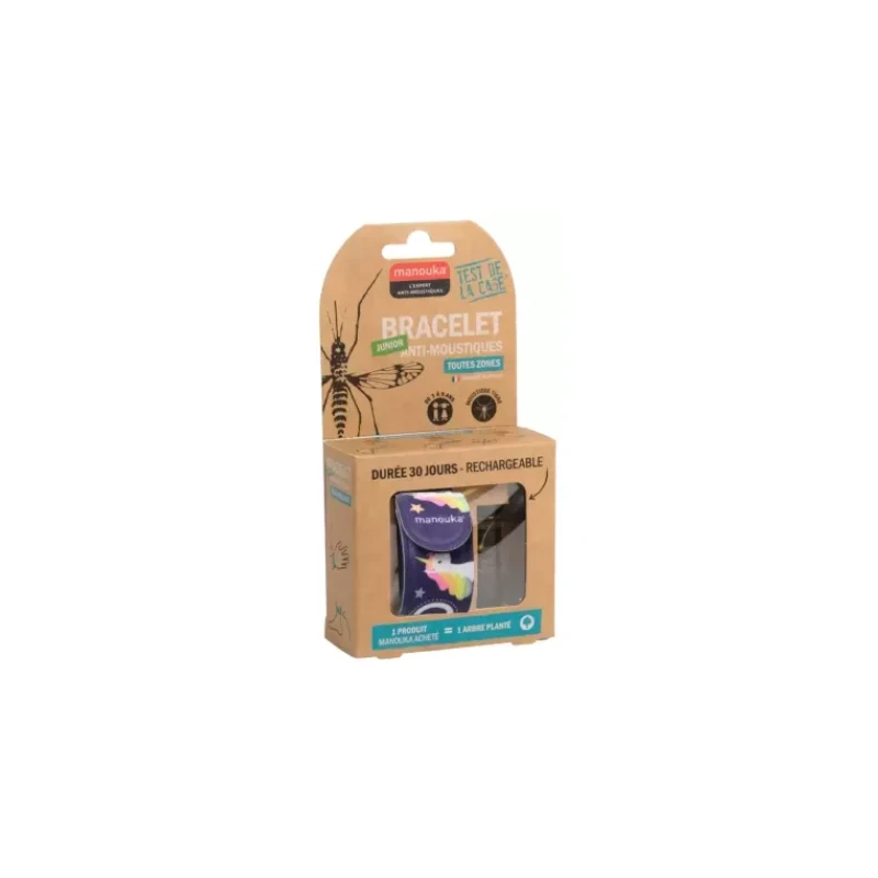 Manouka Bracelet Anti-Moustiques Junior + Recharge 6 ml – Modèle : Licornes est un bracelet pour les enfants de 3 à 9 ans qui s’utilise en toutes zones pour une efficacité contre les moustiques tigres et les mouches.