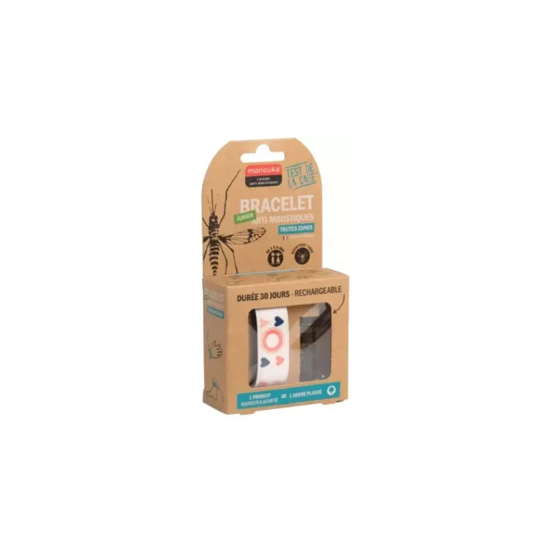Manouka Bracelet Anti-Moustiques Junior + Recharge 6 ml est un bracelet pour les enfants de 3 à 9 ans qui s’utilise en toutes zones pour une efficacité contre les moustiques tigres et les mouches.