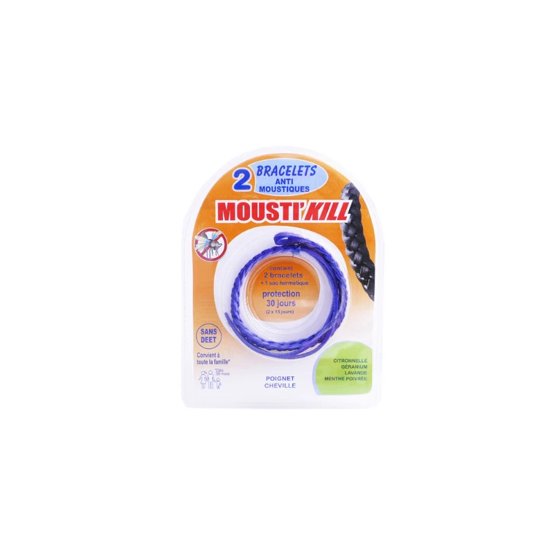 Le Bracelet anti-moustique Mousti’kill design et à la mode résistant à l’eau, protège des piqûres des moustiques grâce aux huiles essentielles (géranium, menthe poivrée, lavande, citronnelle). Ces huiles vont se libérer en continu lors du port du bracelet et ainsi éloigner les moustiques pendant 15 jours.