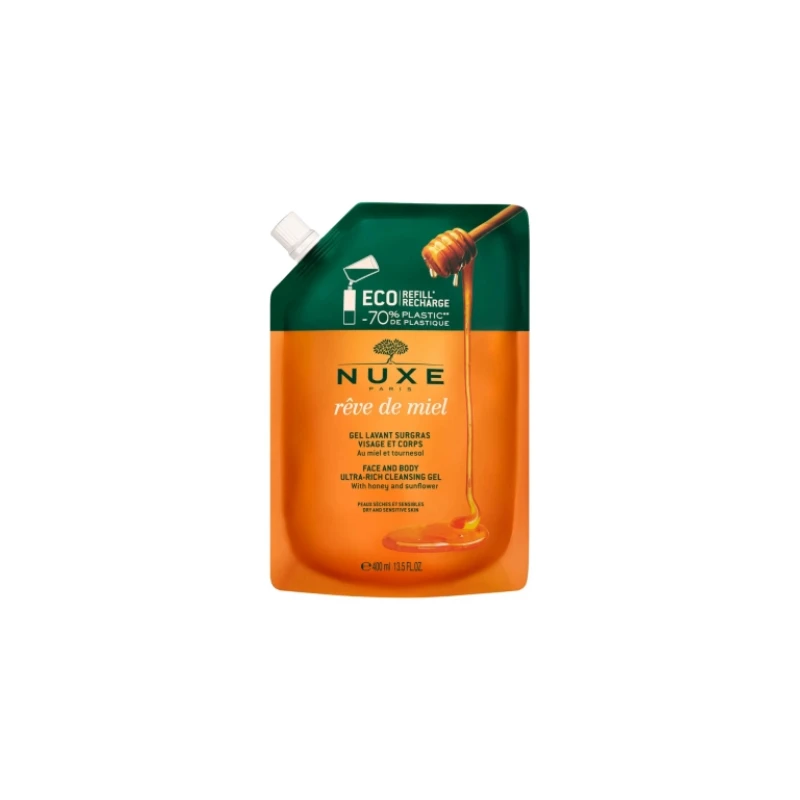 Nuxe Rêve de Miel Gel Lavant Surgras Éco-Recharge 400 ml est un gel douche visage et corps qui nettoie, apaise et adoucit les peaux sèches et sensibles sans les dessécher. Au miel et au tournesol, onctueux et délicieusement miellé, il prend quotidiennement soin des peaux sèches et sensibles en respectant le film hydrolipidique.