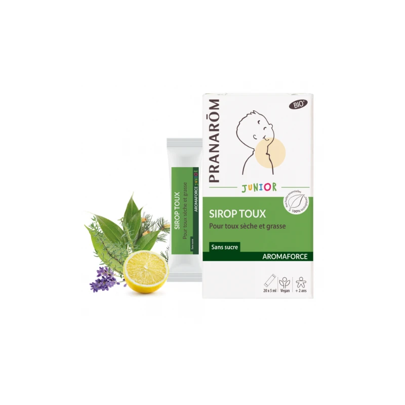 Aromaforce Sirop Toux junior en sachet est un dispositif médical. Il est indiqué pour le traitement de la toux sèche et grasse chez les enfants à partir de 2 ans.