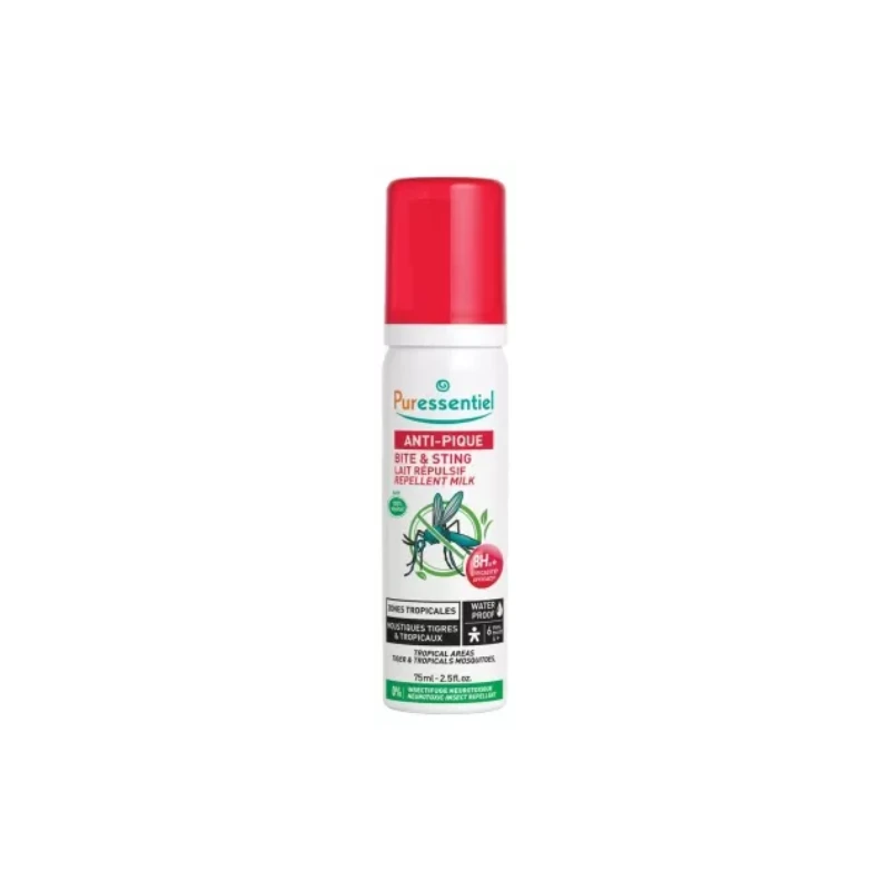 Puressentiel Anti-Pique Lait Répulsif Zones Tropicales 75 ml est un lait à l’actif 100% végétal efficace sur moustiques tropicaux : Anopheles gambiae (8 heures), Aedes aegypti (7 heures 10) et moustiques tigres (Aedes albopictus) (7 heures) ; sur moustiques communs (Culex pipiens) (9 heures) et sur les phlébotomes (Phlebotomus duboscqi) (6 heures 45). Il est l’un des gestes possibles de protection notamment contre les moustiques vecteurs du paludisme, du Zika, de la dengue, de la fièvre jaune et du Chikungunya.