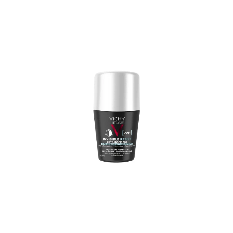 Le dermo-détranspirant Vichy Homme Invisible Resist 72h, formulé spécialement pour les hommes, associe efficacité grâce à son action anti-humidité et anti-odeur et une tolérance optimale avec sa formule sans alcool hypoallergénique testée sur peau sensible pour une action anti-irritations. Sa technologie Invisi-Lock approuvée par l’IFTH (Institut Français du Textile et de l’Habillement) prévient l’apparition de traces jaunes sur les textiles clairs, blanches sur les textiles foncées et des résidus qui peuvent les rigidifier. Les bénéfices de sa technologique de pointe unique est cliniquement prouvée est approuvée par 90% des utilisateurs qui le juge efficace contre les mauvaises odeurs. Efficacité 72H.